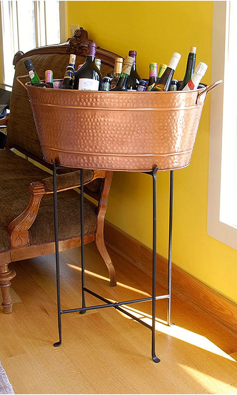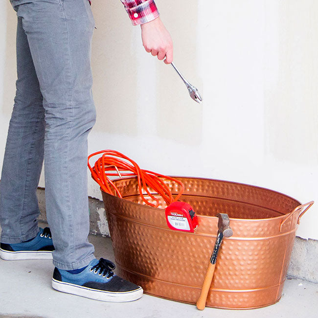 Update your garden décor with a country chic using this Achla Oval Copper Plated Tub with Hammered Finish. This significant unit brings rustic charm and timeless color to your setting in moments, while providing a bevy of uses. The tub handily rests on a level surface in your home or garden, and is perfect for holding firewood, umbrellas, or garden tools. For more versatility, fill the item with ice and use it as a beverage holder during parties, or drill holes in the base to plant directly in it. Two horizontal, raised lines on the body of the tub enhance the rustic look, while a hammered finish adds texture and style. Copper plating over the steel body captures attention, and two handles make it easy to move the piece. Add updated style to your home or landscaping with this Oval Copper Plated Tub with Hammered Finish.