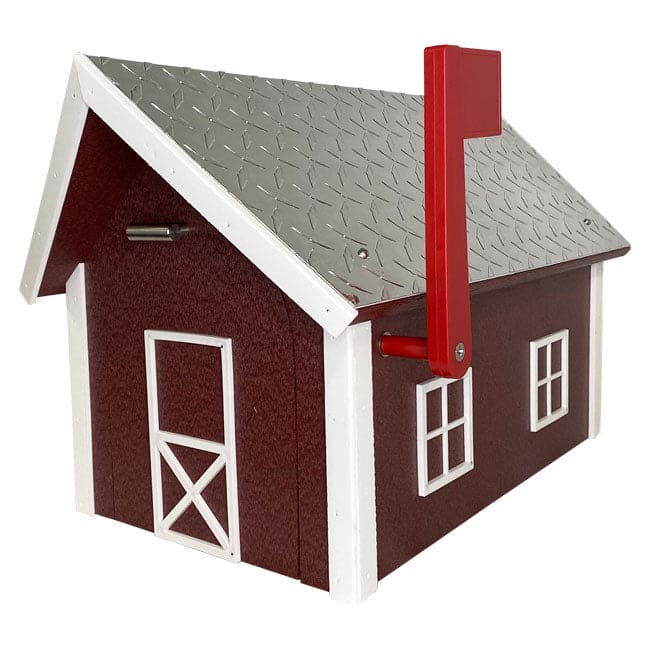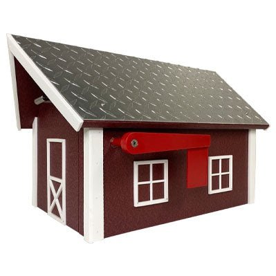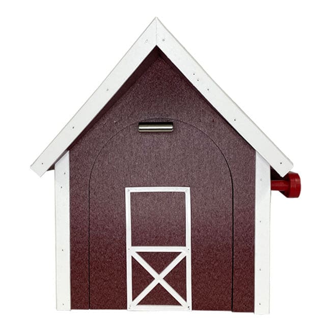 Any man in your life will love this mailbox. This is the gift that will be seen and loved and a daily basis. Make your mailbox a reflection of your penchant for rural architecture with this Cherrywood and White Amish Recycled Plastic Deluxe Mailbox. The dark red body, white trim, and metal clad roof combine on this item to wonderfully mimic a barn, while its recycled plastic lumber construction forms a lasting receptacle. Its generous interior holds plenty of mail, including small packages or catalogs, and the arched door has a magnetic connection to remain securely closed. The white window and door frame shapes offset the deep red body, and a chrome finish on the diamond plate metal roof provides a bit of shine. A bright red flag attaches to the exterior of the mailbox, completing the piece, and its flat base can be attached to a wooden 4 x 4 post or adapter (not included) for a traditional display. The poly body withstands exposure to the elements without warping or peeling, and the colors remain bright and visible for seasons of service. Accent the classic architecture of the countryside with this Cherrywood and White Amish Recycled Plastic Deluxe Mailbox. Made in the USA.