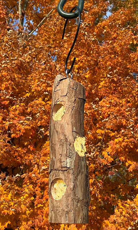 Ensure your bird sanctuary and one of its feeding stations are as pure as possible by placing this Cedar Suet Log Feeder by Prime Retreat in it. This solid, cedar cylinder brings natural materials and colors to your bird garden, while working with birds' instinctive feeding behaviors. The bark covered exterior of the log creates plenty of clinging spots for your feathered friends, while triple, 1.375" diameter tunnels through it easily hold suet plugs. Fissures and outcroppings on the bark body offer a variety of perching and clinging spots for birds, and suet helps them maintain their energy. Suspend this unit from a hanger or bracket using its robust, top metal eyehook, and alter the flavors of the suet in each tunnel to see what your feathered friends prefer. For more avian activity, add a bit of spreadable suet onto the exterior of this feeder. Encourage your backyard birds to dine naturally by adding this Cedar Suet Log Feeder to your yard. Made in the USA.