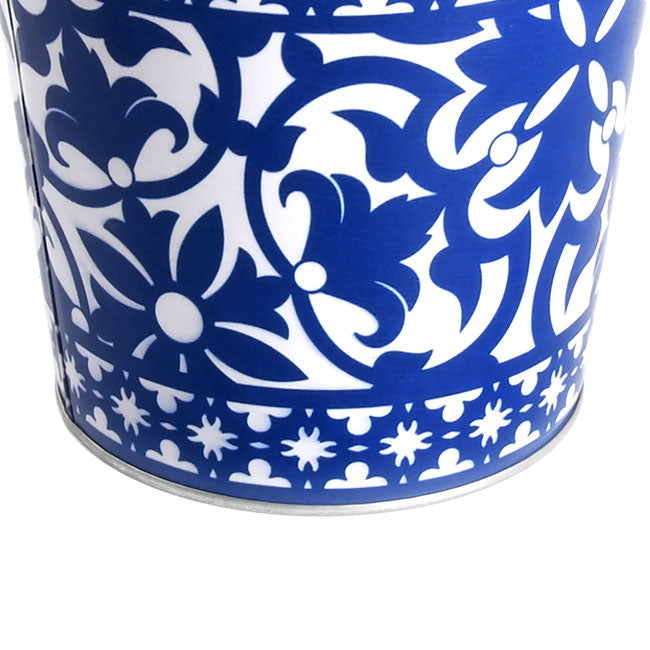 Add vivid color to your garden or patio in two ways using this Esschert Design Portuguese Style Flower Pot. A blue and white, floral pattern adorns the exterior of this classic, metal planter, evoking tiles commonly made and found on the Iberian peninsula. The 4.625" diameter base rests on a level surface with ease, and the body expands to a 6.125" diameter, top opening for a traditional silhouette. This also provides plenty of planting room for an herb or small flower, and a rolled rim at the top of the item completes it. A galvanized finish on the interior contrasts the blue and white exterior, and the stylized flower shapes celebrate your greenery. The compact size is simple to place virtually anywhere, and the metal construction remains durable. Bring a bit of beautiful Portugal to your garden using this Portuguese Style Flower Pot.