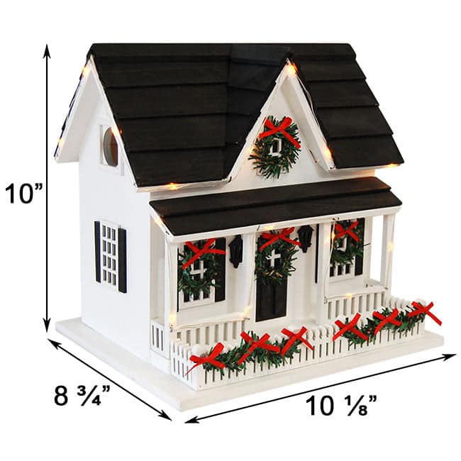Delightfully adorn your bird garden with yuletide cheer using this Home Bazaar Holiday Bird House with LEDs. This ornate, wooden shelter brings timeless architecture to your yard, thanks to its rectangular frame, pitched roof, and front dormer. A picket fence, faux door and windows, and front porch further the realistic effect, and lantern silhouettes flanking the door complete the look. A wealth of fabric wreaths and garland adorns the fence, windows, and door, and red bows on each piece of greenery bring the classic Christmas color scheme to the forefront. A wire with sporadic, yellow hued LEDs accents the roof line and frame of the abode, powered by 3 AA batteries (not included) in the internal battery compartment. This compartment also has an On-Off switch with auto timer, illuminating the unit for 6 hours each evening, and a large, removable back panel allows you to access this section as needed. This area also acts as a roosting spot for small songbirds, thanks to the 1.25" diameter entry hole on one side of the piece. Drainage holes on the level base of the item help the nest remain dry, and the white color on the body prevents nestlings from overheating. Place this adornment on a level surface inside your home to enhance your miniature village, or use the included, decorative bracket to brace it against a wall or wooden post outdoors. The black and white hues add timeless style to any setting, and the wooden construction is a favorite of your feathered friends. Celebrate the winter holidays with your backyard birds by placing this Holiday Bird House with LEDs in your landscaping.