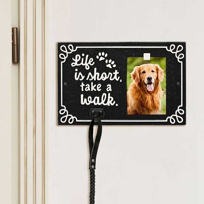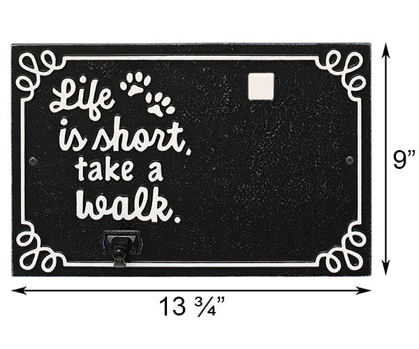 Display your love for your pup and keep his or her leash within easy reach using this Whitehall Black "Life is Short, Take a Walk" Plaque with Hook. This hefty, all aluminum unit not only accommodates a leash easily; it also has a spot to showcase a photo of your four legged family member. The phrase "Life is short, take a walk" in script adorns one side of the rectangular marker, with two paw prints near the top of it furthering the pet motif. The white paint on the text and border contrasts the black background, and these decorative elements are cast onto the item for durability and longevity. Attach the included photo clip to the right side of the marker to hold a picture of your dog, lending a custom and versatile look to the piece. Additionally, an included, 2.5" long hook attaches to the sign beneath the text, holding a leash or harness easily. Included screws make it simple to place the item against a wall, and the aluminum body remains lovely for many seasons of service. Provide your pet with his or her own organizational spot with this Black "Life is Short, Take a Walk" Plaque with Hook. Some assembly required. Made in the USA.